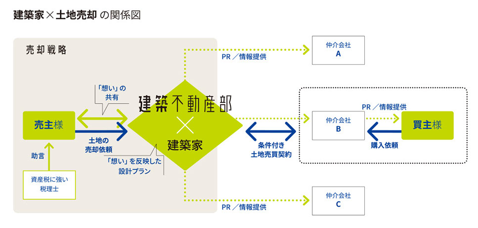 資産税に強い税理士・不動産鑑定士、不動産訴訟に強い弁護士とチームで建築家をサポートします。